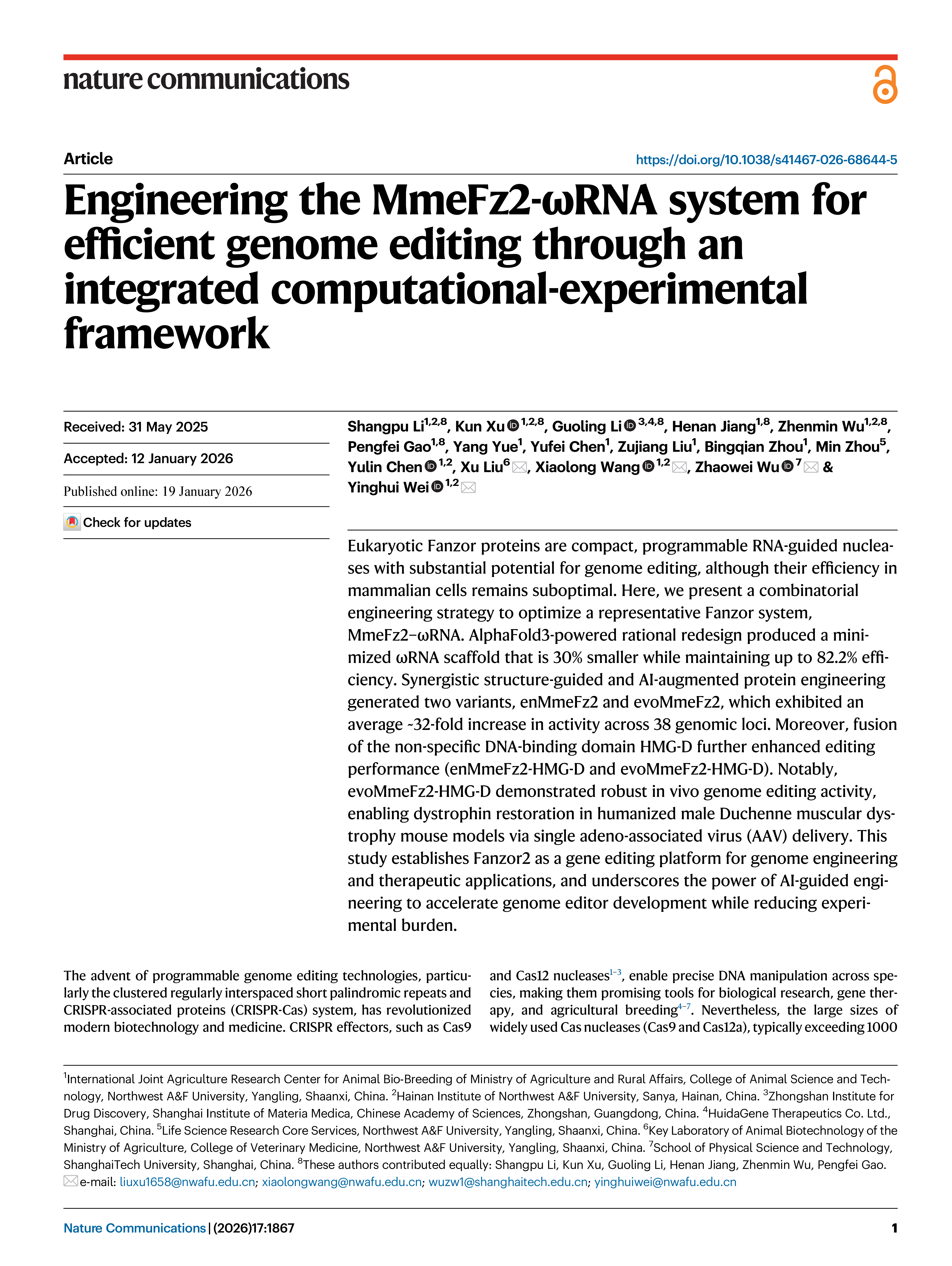 徐坤,男,遗传学博士,副教授,博导;陕西高校未来技术学院建设工作委员会委员,西北农林科技大学-动物科技学院-羊遗传改良与生物育种创新团队、动物生化与分子生物学教研室骨干成员。主要从事动物基因编辑与分子设计育种、微生物基因编辑与合成生物学等方面的教学和科研工作。是最早从事基因编辑技术开发的研究者之一,曾首次报道了源于嗜热链球菌的CRISPR/St3Cas9系统,并相继开发了系列基因编辑工具活性报告技术、供体适配基因编辑系统等动物和酵母基因编辑配套技术。目前致力于糖基化酶碱基编辑器(gBEs)、OMEGA/Fanzor和TIGR/Tas等新型基因编辑工具的优化提升及应用研究。累计在《Nature Chemical Biology》、《Science Advances》、《Nature Communications》、《Trends in Biotechnology》、《Genome Biology》、《Cellular and Molecular Life Sciences》和《生物工程学报》、《遗传》等国内外期刊发表科研论著75篇,被引1187次、H指数18、i10指数26 (谷歌学术,截至2025.12)。担任《BioDesign Rearch》和《生物工程学报》青年编委,《Science China-Life Sciences》、《Nucleic Acids Research》、《Advanced Science》、《Protein & Cell》、《Chemical Engineering Journal》和《遗传》等杂志审稿人。曾获第十三届大北农科技奖二等奖(2/8),陕西首届高校课堂教学创新大赛三等奖(1/1),西北农林科技大学教学成果一等奖一项(3/7)、二等奖两项(1/5,2/4)。负责西北农林科技大学基因编辑科教平台(NWAFU-GEST)建设和运行,开设并主讲本科生《分子生物学》、《基因编辑技术》和研究生《动物基因编辑原理和技术》、《基因编辑原理与技术-海南》等课程。
